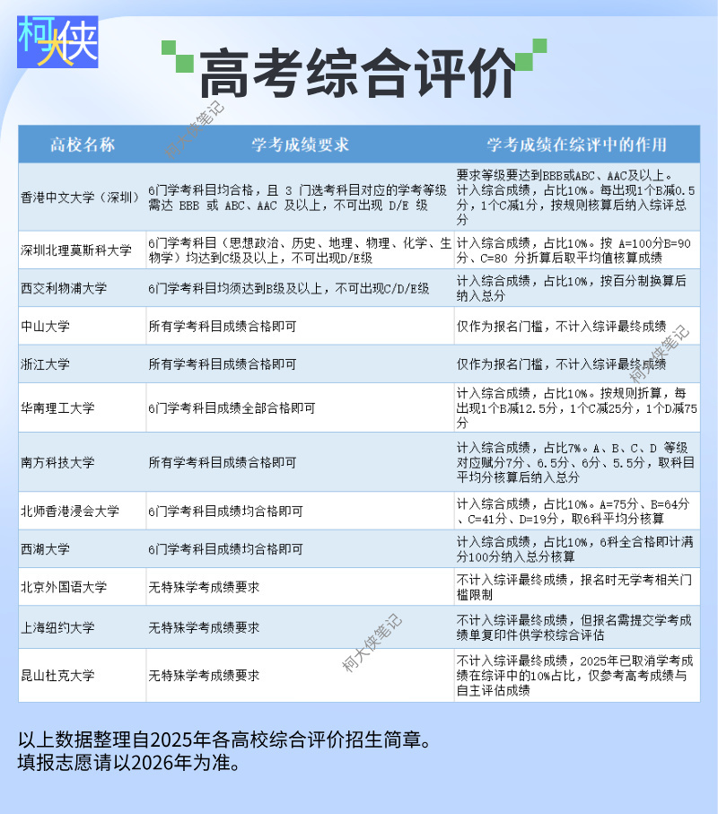 高考综合评价录取参考:部分高校的综合评价录取,会将学考的合格情况和等级作为重要参考依据(2025 年共有12所高校在广东展综合评价招生,其中省内6所、省外6所,不同高校对学考成绩的要求差异较大);