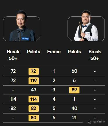 其中关注度最高的2场比赛,傅家俊和常冰玉都以5比1的比分大胜对手。老将傅家俊迎战许医尘,开局傅家俊就连续轰出2杆单杆72分,2比0取得梦幻开局,虽然第3局双方在焦灼的防守大战中43比59傅家俊丢掉一局,但接下来的比赛傅家俊重新主宰了比赛,单杆114分和82分,傅家俊连下3局,大比分5比1一波流带走了比赛。