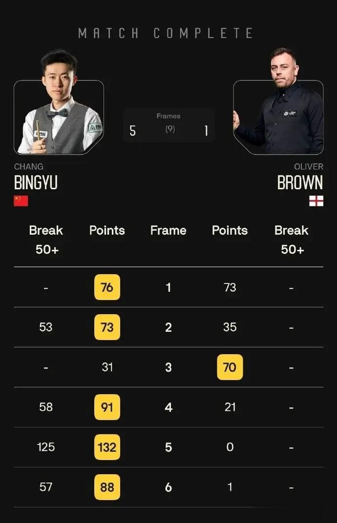 另外一场比赛中国23岁小将常冰玉迎战奥利弗·布朗,比赛的走势和傅家俊的一模一样,常冰玉开局2连鞭梦幻开局建立优势,虽然第3局常冰玉31比70丢掉一局,但后面的比赛常冰玉连续单杆58分、125分、57分,大比分5比1晋级96强。